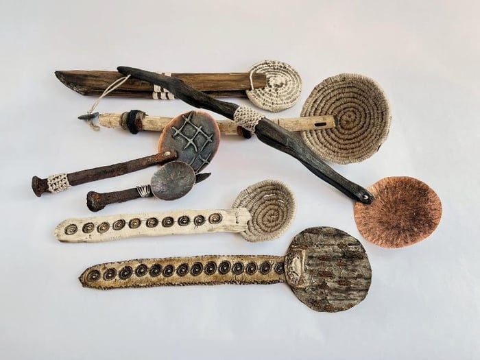 From the original spoon work, Liz allowed ideas to lead naturally into new forms. Brushes followed. Then larger spoons. Then bowls bound, wrapped and layered with paper, fibre and metal. Some pieces were burned, repaired and reworked. Others were deliberately unresolved.